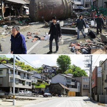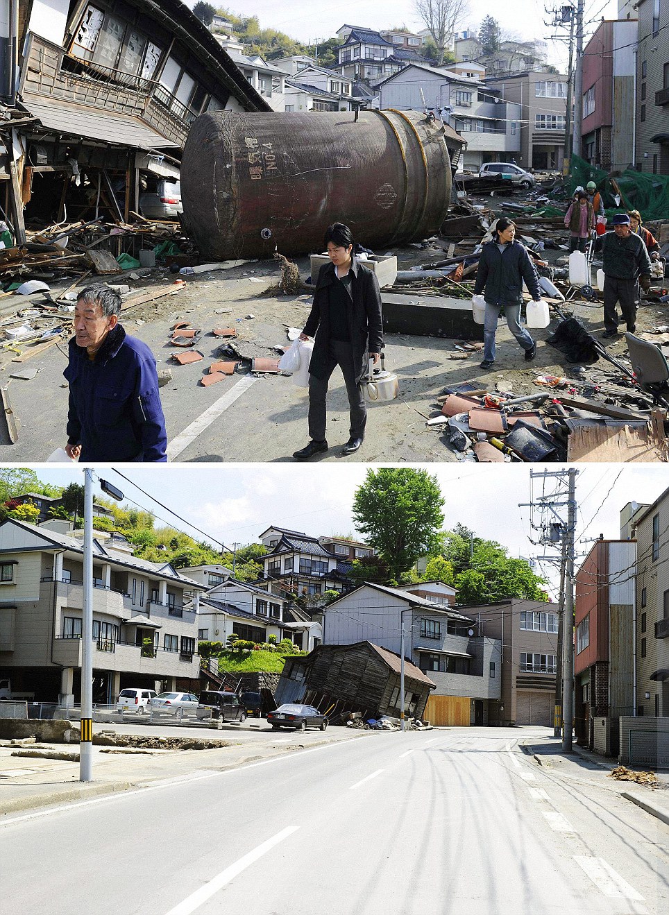 Combined photo shows local residents walking through debris on a street in Kesennuma, Miyagi Prefecture, to get water on March 14, 2011 ( top frame ), three days after the massive earthquake and tsunami struck the area, and the same area on June 3, 2011 ( bottom frame ). A large tank and a damaged house on the left side of the street have been cleared away.
