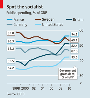 Annual growth as high as 6.4% in the first quarter. Unemployment falling fast. The budget in surplus this year. Public debt heading to below 40% of GDP. How did the Swedes do it? Luck, partly. Like Germany, Sweden is a big manufacturing exporter. In both countries GDP rebounded in 2010 after a sharp fall in 2009. Being outside the euro helped, because the krona fell before climbing back. But the main answer is the prudent pro-market policies of Fredrik Reinfeldt’s four-party centre-right coalition, which came to power in October 2006. As Mr Reinfeldt’s capable (and pony-tailed) finance minister, Anders Borg, explains, Sweden learned a lot from its banking bust in the early 1990s. Budgetary rules and bank supervision were strengthened, helping to avert the risk of another bubble. Tight fiscal policy has pushed the public sector’s share of GDP down to only just over 50% (see chart): Mr Borg has ambitions to get it below Britain’s. Without dumping the generous Swedish social model, the government has tweaked it in the direction of lower taxes and smaller welfare benefits. Mr Borg calls this “reinforcing the work ethic”. Mr Reinfeldt talks simply of making work pay. [Source]