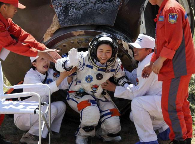 China’s first female astronaut Liu Yang waves as she comes out of the re-entry capsule of Shenzhou-9 spacecraft in Siziwang Banner of north China’s Inner Mongolia Autonomous Region. Liu and two other crew members emerged smiling from the capsule that returned safely to earth Friday from a 13-day mission to an orbiting module that is a prototype for a future space station.