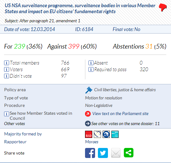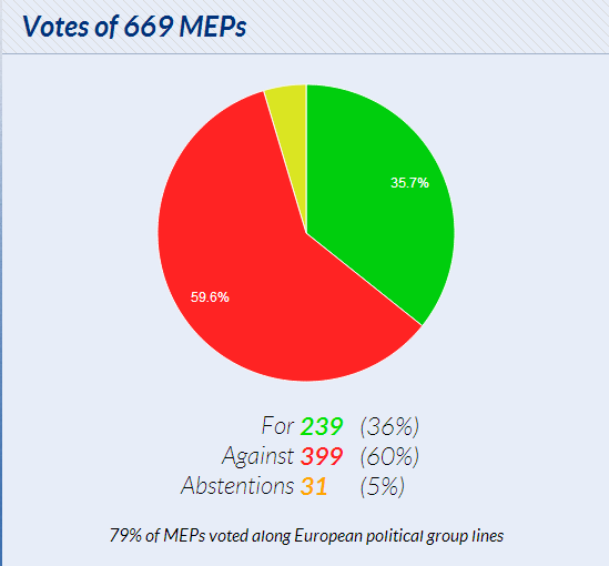 239 MEPs voted yes to giving Edward Snowden protection, 399 voted no, 31 abstained today in the EU parliament. The final vote was therefore a no. View more details about the vote here.