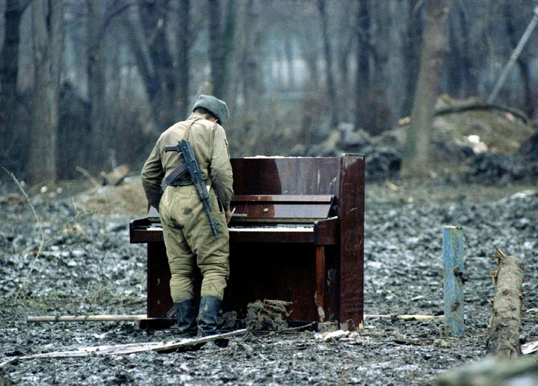 I found this picture on Reddit,posted by red321red321, who describes it as “A Russian soldier playing an abandoned piano in Chechnya in 1994.”