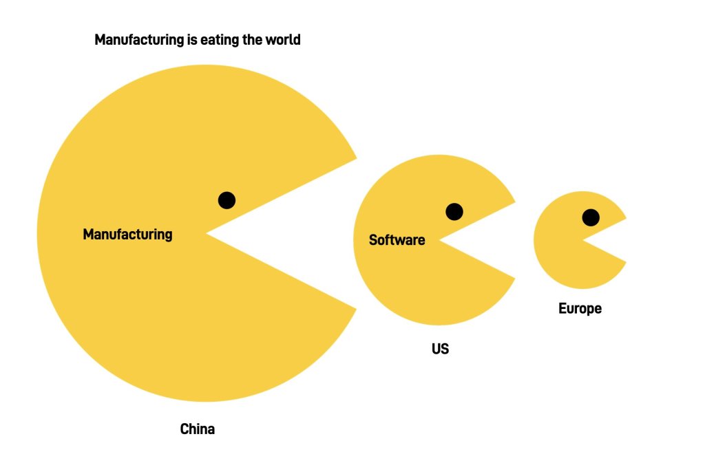 Europe fell behind with software so companies like German car manufacturers can’t compete with EVs. Meanwhile the US not only has less network effects than China, it has less control of supply chains (e.g. batteries and components) so still relies on China for manufacturing or components so Tesla can’t compete with BYD. China wins this third era of digitisation where it meets all physical goods.