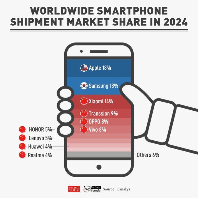 And while it’s true that the US also has Apple and Tesla as modern hardware companies. Apple doesn’t really manufacture anything and nearly all of it is done in Asia, mostly in China. Half of Tesla’s cars are made in China. Collectively both of their sales have been eclipsed by domestic Chinese brands.
