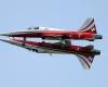 Two Northrop F-5E Tiger II airplanes of the Swiss Patrol fly close together during an aerobatic performance at the ILA Berlin Air Show in Berlin, Germany.